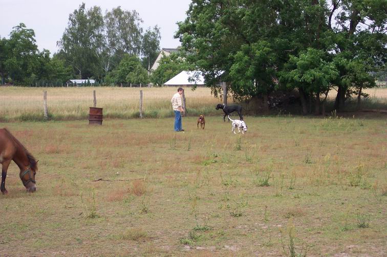 3000 Quadratmeter großer Hundefreiauslauf. Hier werden die Hunde jeweils vormittags und abends in zusammenpassenden Gruppen "bespielt".